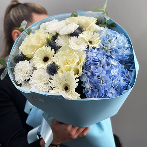 Букет "Прага" из гортензий, французских роз, гербер, эрингиума и кустовых хризантем