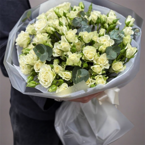 Букет из 17 кустовых белых роз и веточек эвкалипта (60 см)