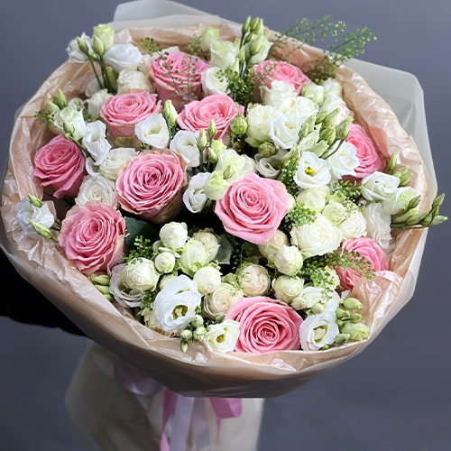 Букет "Пудровая мечта" из роз и эустом